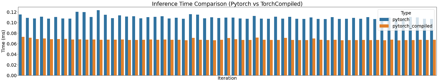 Profiling Default vs Compiled versions across 100 runs we’ll get a chart similar to this: