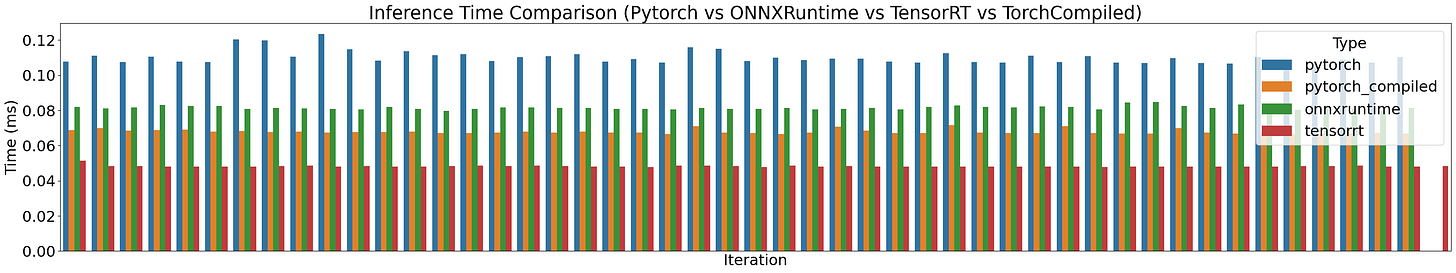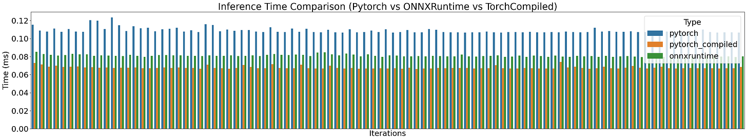 Now, if we profile PyTorch vs PyTorch Compiled vs ONNXRuntime across 100 runs we’ll get a chart similar to this one: