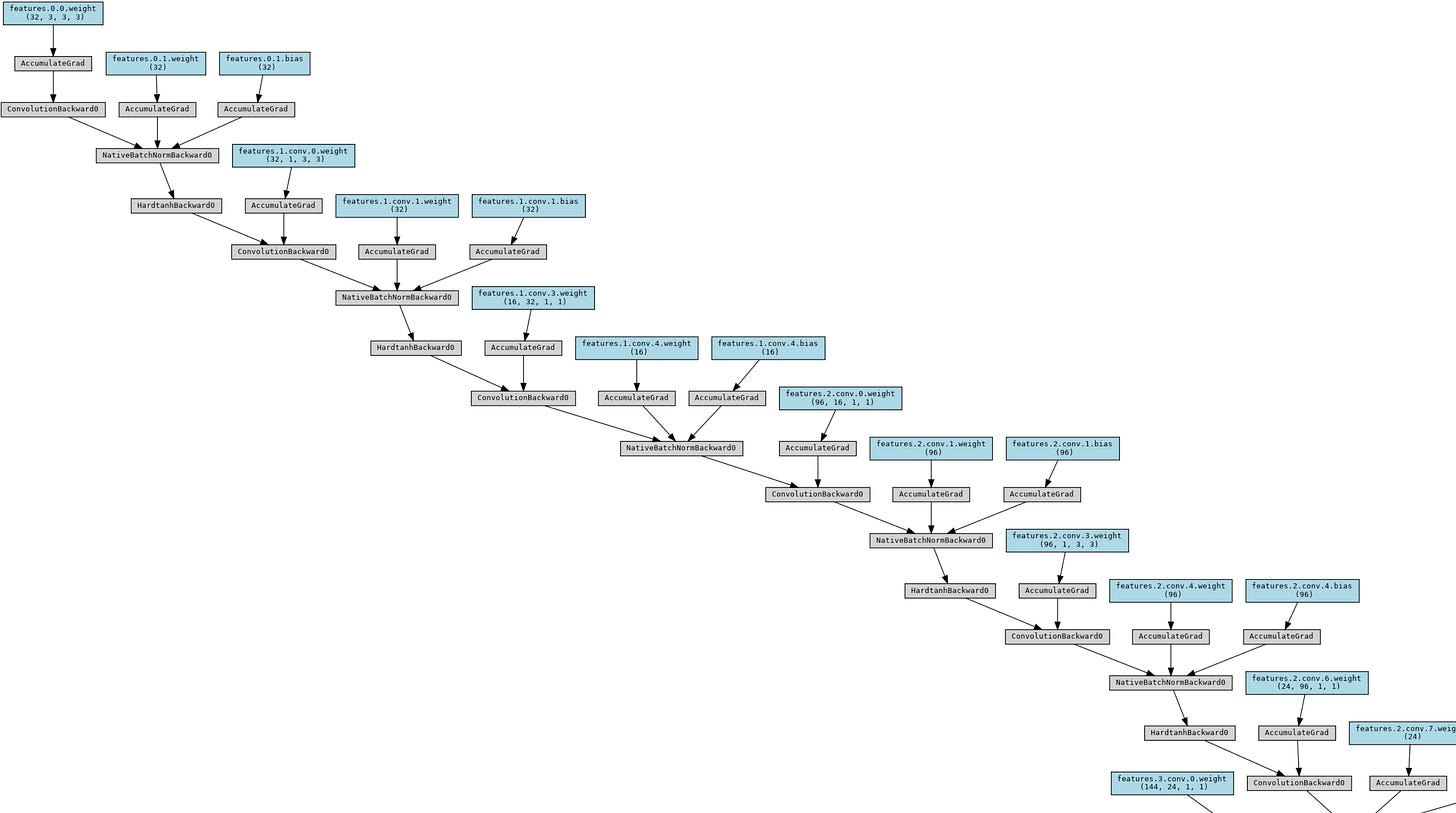 In our case, we’ve defined our MobileNet v2 model as a PyTorch nn.Module, and then we can visualize it using this code block: