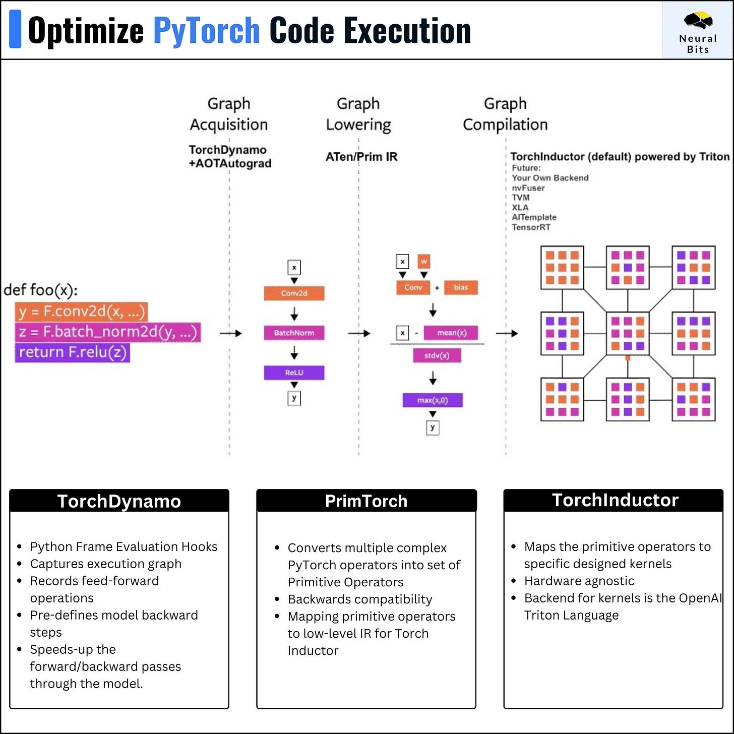 In the same way, TorchInductor compiles PyTorch code into Low-Level IR (intermediate representation code) and then it ports this code to kernels specifically designed for the target architecture (CPUs, TPUs, GPUs, etc.)