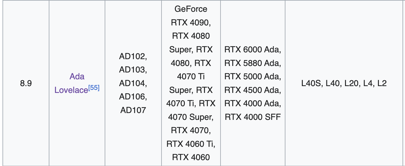 For example, the consumer GPU RTX 4080 and the enterprise GPU L40 both have a Compute Capability of 8.9 and are based on the Ada Lovelace chip architecture.