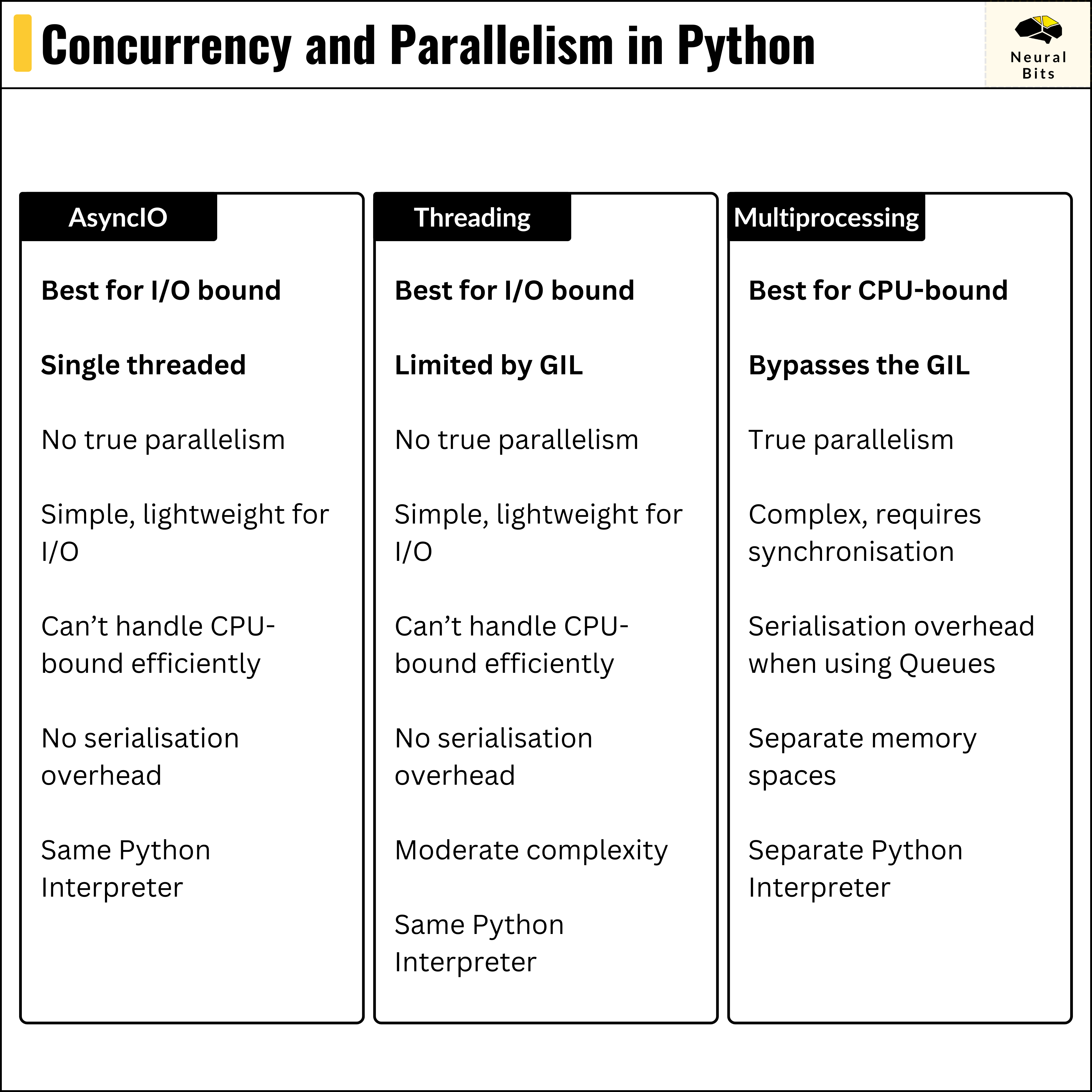 In this article, you’ve learned everything you need to know about concurrency in Python and when to use asyncio, multithreading, and multiprocessing.