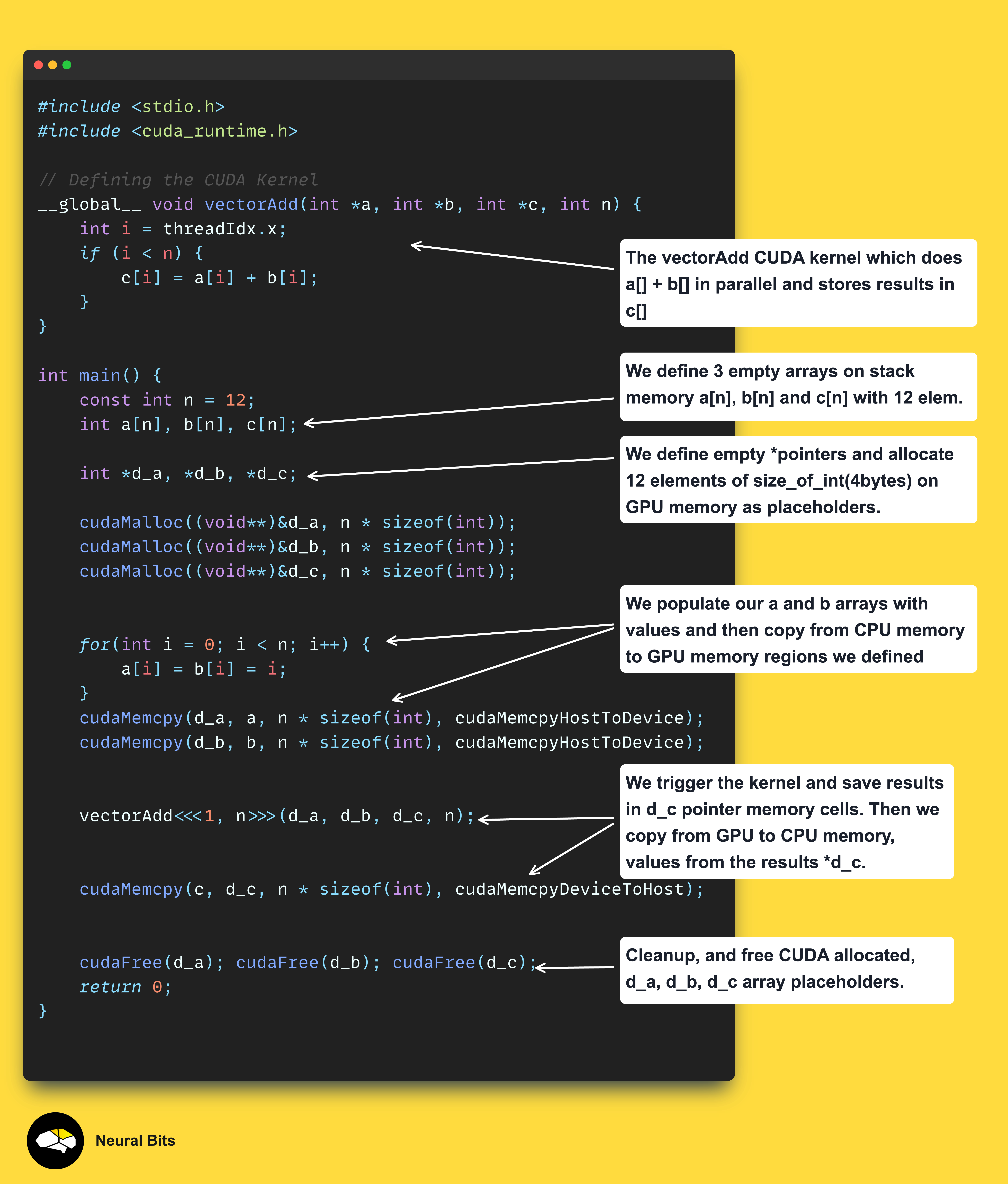 Let’s now unpack and see a basic vectorAdd CUDA kernel in C++, and how it works as described in the image below: