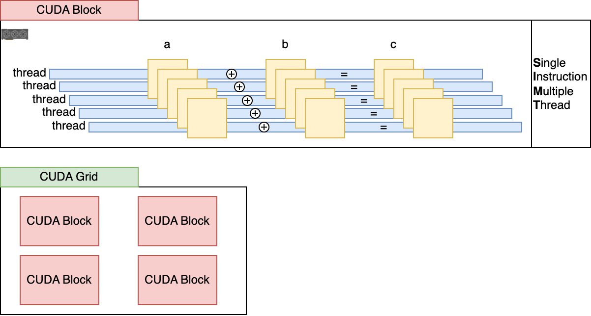 In the case above, given that N=12, this kernel will be executed in parallel on 12 threads at once, a concept called SIMT (Single Instruction Multiple Thread). The results are then pooled from the GPU memory to the CPU memory, where we can access them. Below is an illustration of how kernels are split into threads.