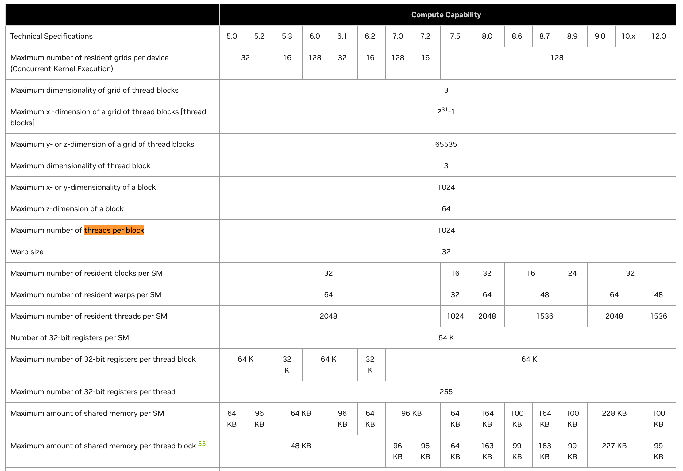 Below you can find the official CUDA documentation cheatsheet mapping GPU architecture specifications based on the Compute Capability factor.
